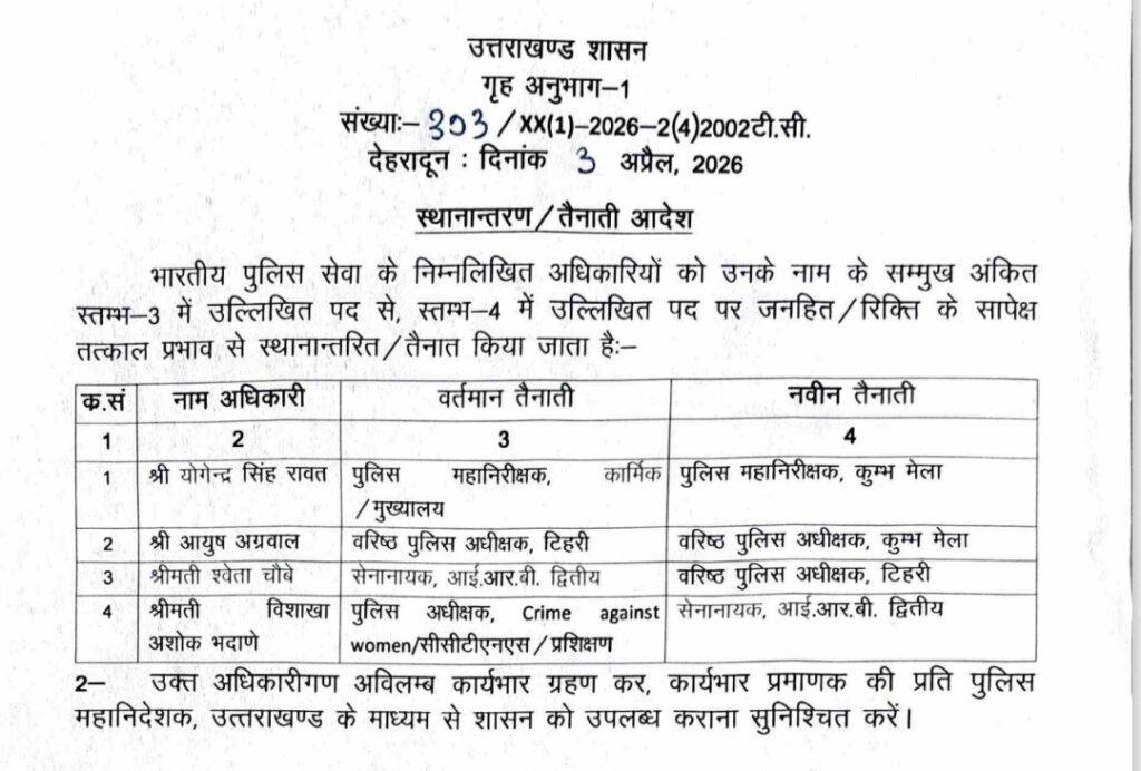 देहरादून: उत्तराखंड शासन ने राज्य की पुलिस व्यवस्था को और अधिक सुदृढ़ बनाने तथा भविष्य की चुनौतियों के लिए तैयार करने के उद्देश्य से भारतीय पुलिस सेवा (IPS) के चार वरिष्ठ अधिकारियों के स्थानांतरण और नई तैनाती के आदेश जारी किए हैं। सचिव शैलेश बगौली के हस्ताक्षर से जारी इस आधिकारिक सूची में कुम्भ मेले की सुरक्षा व्यवस्था और जिला स्तर पर कानून व्यवस्था को प्राथमिकता दी गई है। यह निर्णय शासन द्वारा जनहित और रिक्त पदों को भरने के उद्देश्य से लिया गया है।