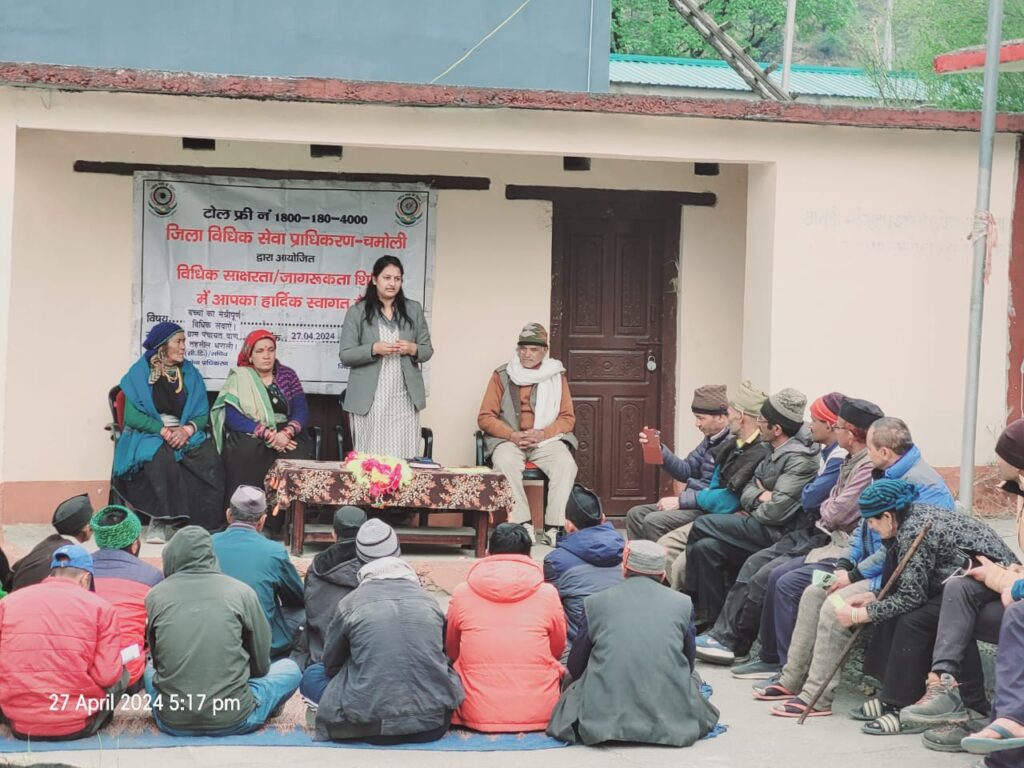 उत्तराखण्ड राज्य विधिक सेवा प्राधिकरण, नैनीताल द्वारा प्रेषित मासिक प्लान ऑफ एक्शन एवं माननीय जनपद न्यायाधीश/अध्यक्ष जिला विधिक सेवा प्राधिकरण, चमोली के निर्देशन में जिला विधिक सेवा प्राधिकरण, चमोली द्वारा दिनांक 27 अप्रैल, 2024 को गोपेश्वर मुख्यालय से लगभग 150 किलोमीटर दूरी पर स्थित नंदा देवी राष्ट्रीय राजमार्ग के सुदूरवर्ती क्षेत्र एवं भारत के अन्तिम गाँव वाण, तहसील थराली में विधिक साक्षरता एवं जागरूकता शिविर का आयोजन किया गया।