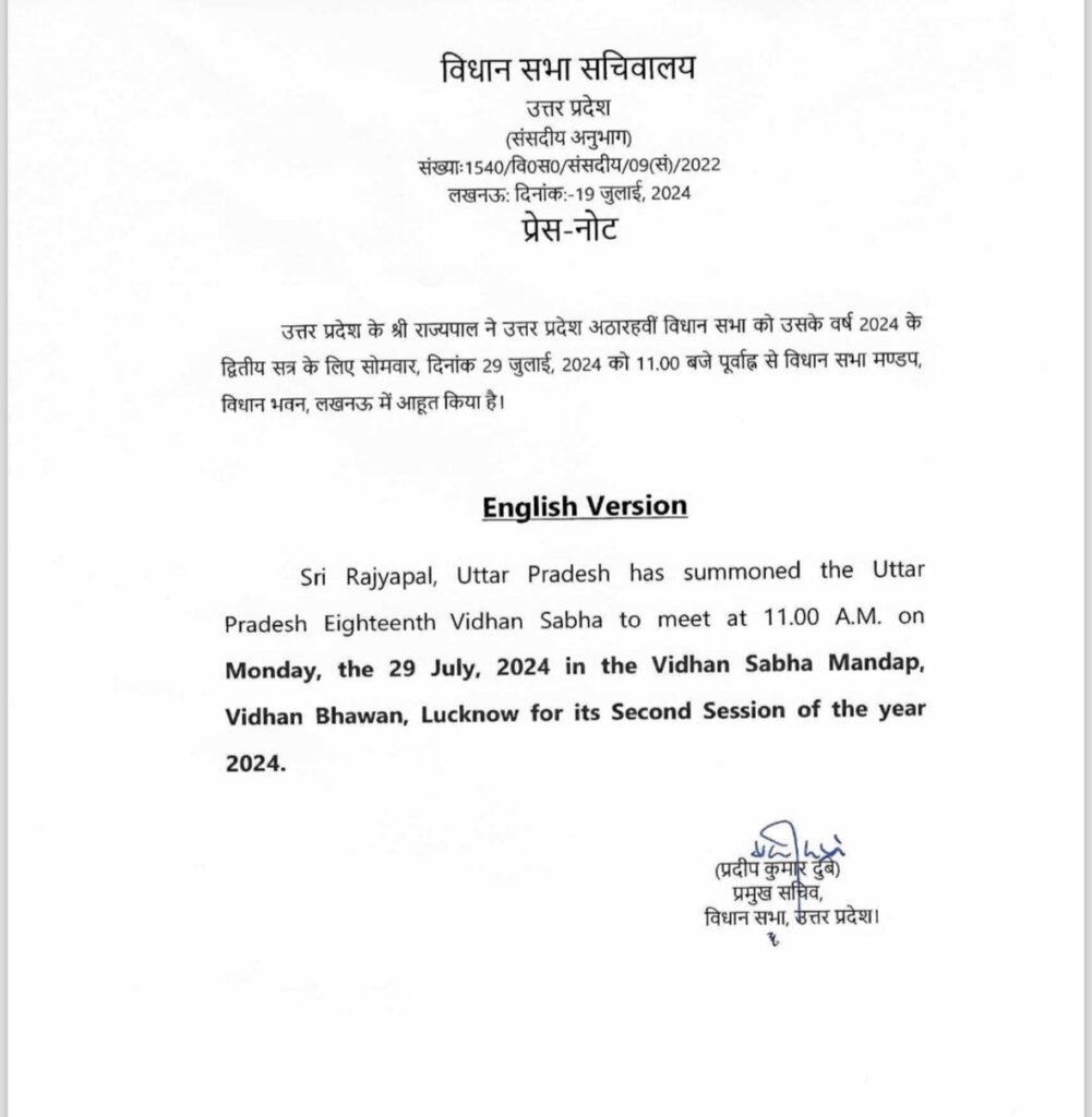 UP monsoon assembly session उत्तरप्रदेश विधानसभा सत्र 29 जुलाई 2024 को होगा शरू,