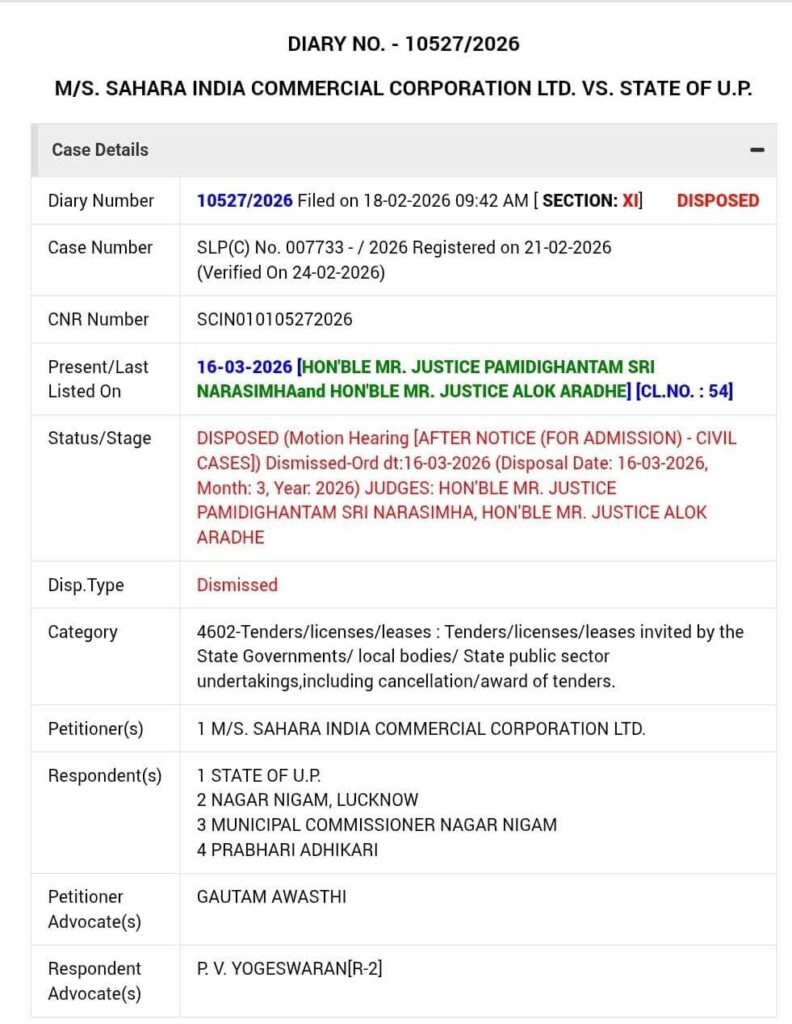 सहारा इंडिया को सुप्रीम कोर्ट से बड़ा झटका: ‘सहारा शहर’ की लीज रद्द करने के यूपी सरकार के फैसले पर मुहर, याचिका खारिज